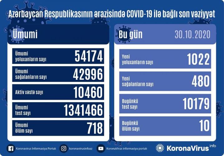 Azərbaycanda indiyədək ümumilikdə 54174 nəfər koronavirus infeksiyasına yoluxub, onlardan 42996 nəfər müalicə olunaraq sağalıb, 718 nəfər vəfat edib, aktiv xəstə sayı 10460 nəfərdir.