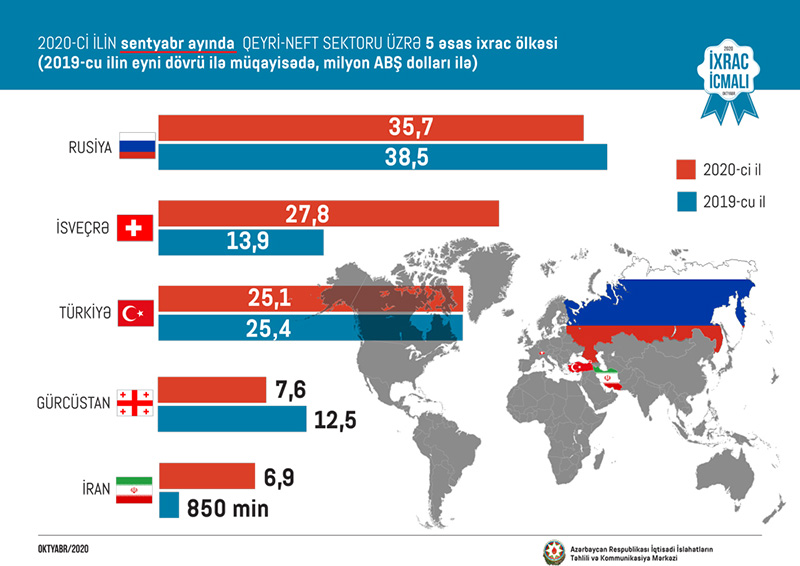 Bu ilin yanvar-sentyabr ayları ərzində Rusiyaya 485,9 milyon, Türkiyəyə 252 milyon, İsveçrəyə 166,1 milyon, Gürcüstana 99,6 milyon və Çinə 33,4 milyon ABŞ dolları dəyərində qeyri-neft sektoruna aid mal ixrac olunub.