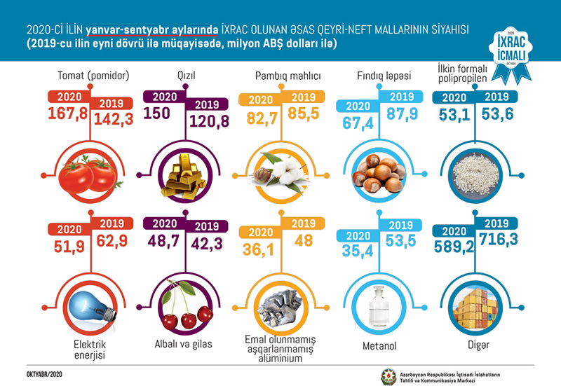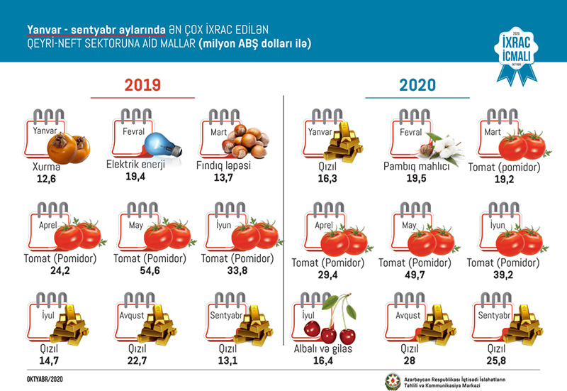 2020-ci ilin yanvar-sentyabr ayları ərzində ixrac edilən qeyri-neft sektoruna aid malların siyahısında tomat (pomidor - 167,8 milyon ABŞ dolları) birinci, qızıl (sikkə kəsilməsində istifadə olunmayan, digər emal olunmamış formalarda - 150 milyon ABŞ dolları) ikinci və pambıq mahlıcı (82,7 milyon ABŞ dolları) üçüncü olub.