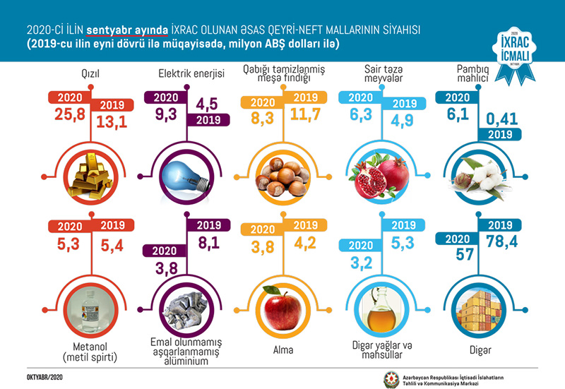 2020-ci ilin sentyabr ayında qeyri-neft sektoru üzrə ixracda qızıl (25,8 milyon) birinci, elektrik enerjisi (9,3 milyon ABŞ dolları) ikinci, qabığı təmizlənmiş meşə fındığı – (8,3 milyon ABŞ dolları ) üçüncü yerdə qərarlaşıb.