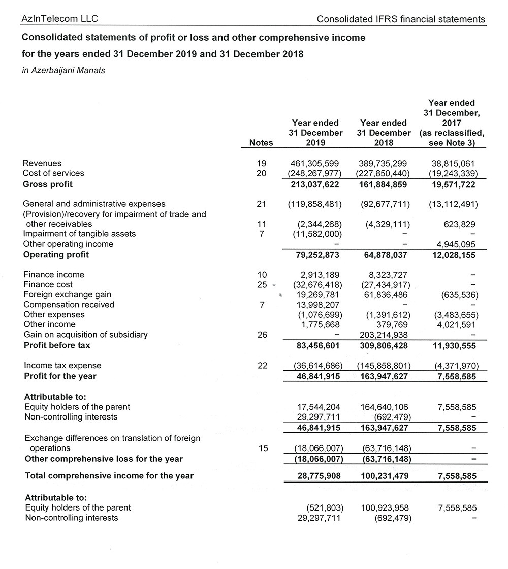 Ötən il “AzInTelecom”un göstərdiyi xidmətlərdən gəlirləri 461 milyon 306 min manat (illik müqayisədə 18,4% çox), xidmətlərinin maya dəyəri 248 milyon 268 min manat (8,9% çox), ümumi və inzibati xərcləri 119 milyon 858 min manat (29,3% çox), debitor borclar üzrə ayırmaları 2 milyon 344 min manat (45,9% az), maddi aktivlərinin dəyərsizləşməsi üzrə zərəri 11 milyon 582 min manat (ötən il ayırmayıb), maliyyə gəlirləri 2 milyon 913 min manat (2,6 dəfə az), maliyyə xərcləri 32 milyon 676 min (19,1% çox), xarici valyutaların mübadiləsindən gəlirləri 19 milyon 270 min manat (68,8% az), kompensasiyalardan gəlirləri 13 milyon 998 min manat (əvvəlki il ayırmayıb), digər gəlirləri 1 milyon 776 min manat (4,6 dəfə çox), digər xərcləri 1 milyon 77 min manat (22,6% az), mənfəət vergisi ödəmələri isə 36 milyon 615 min manat (4 dəfə çox) təşkil edib.