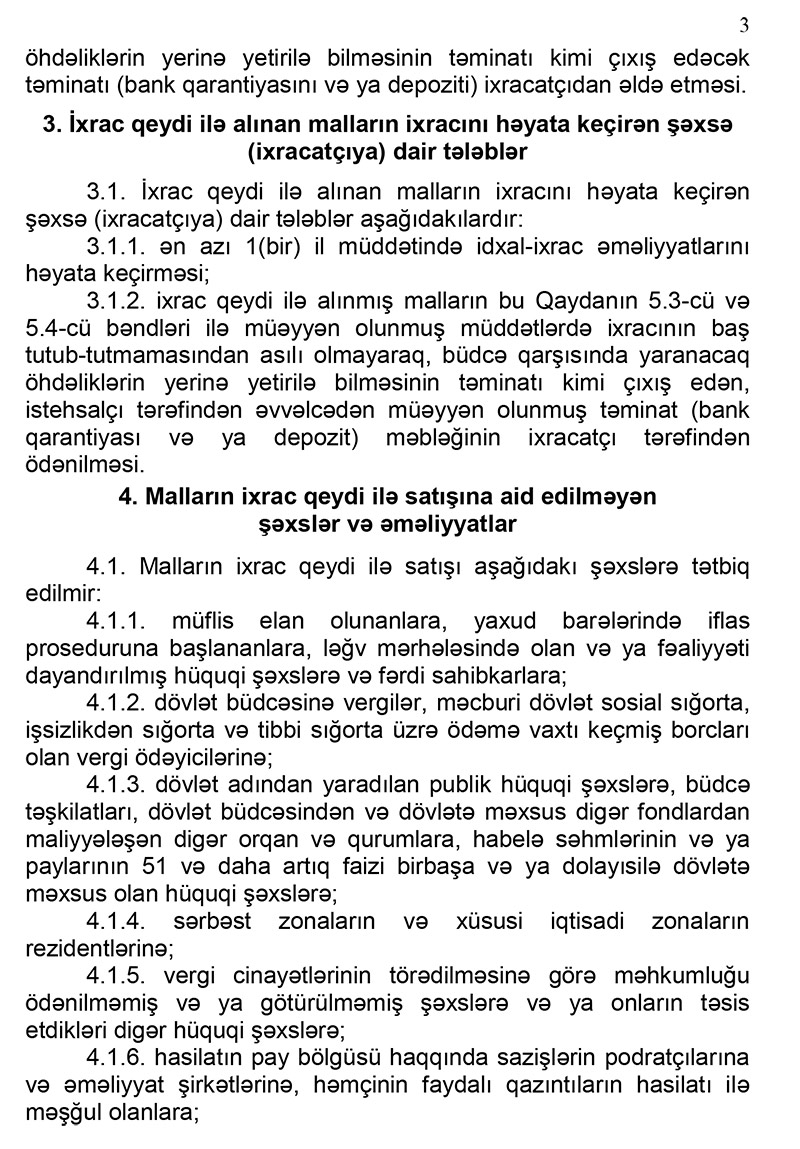 “Malların ixrac qeydi ilə satışı Qaydası”nda ixrac qeydi ilə satış həyata keçirən şəxsə (istehsalçıya), ixrac qeydi ilə alınan malların ixracını həyata keçirən şəxsə (ixracatçıya) dair tələblər, malların ixrac qeydi ilə satışına aid edilməyən şəxslər və əməliyyatlara nəzarət, ixrac qeydi ilə malların ixracının həyata keçirilməsi prosesinə nəzarət tədbirləri öz əksini tapır.