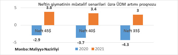 Neftin qiymətinin müxtəlif ssenarilərindən asılı olaraq bu il və gələn il Azərbaycanda Ümumi Daxili Məhsulun artım proqnozu aşağıda verilib.