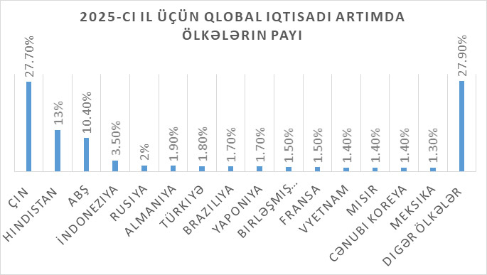 Çin ilə bağlı müsbət xəbərlərin dünya iqtisadiyyatına müsbət təsir edəcəyini eyni ilə Beynəlxalq Valyuta Fondu da vurğulayır. Belə ki, qurumun bu yöndə olan açıqlamaları maraqlıdır. Onların hesablamalarına görə 2021-ci ildə Çinin dünya iqtisadiyyatındakı artım payının 26,8%-dən artaraq 2025-ci ildə 27,7% təşkil edəcəyi qeyd olunur. Beynəlxalq Valyuta Fondu qeyd edir ki, Çində olan iqtisadi artım tək bir səbəbdir ki, onlar 2019-cu il ilə müqayisədə 2021-ci ildə global iqtisadi artımın 0,6% çox olacağını proqnozlaşdırır. Çinin gələcək 5 il ərzində dünyada artan rolunu başa düşmək üçün Beynəlxalq Valyuta Fondunun məlumatlarına nəzər salmaq kifayətdir. Belə ki, Beynəlxalq Valyuta Fondunun məlumatları əsasında və Bloombergin hesablamalarına görə 2025-ci il üçün qlobal iqtisadi artımdakı payına görə 15 ölkənin azalan istiqamətdə sıralaması təqdim edilib: