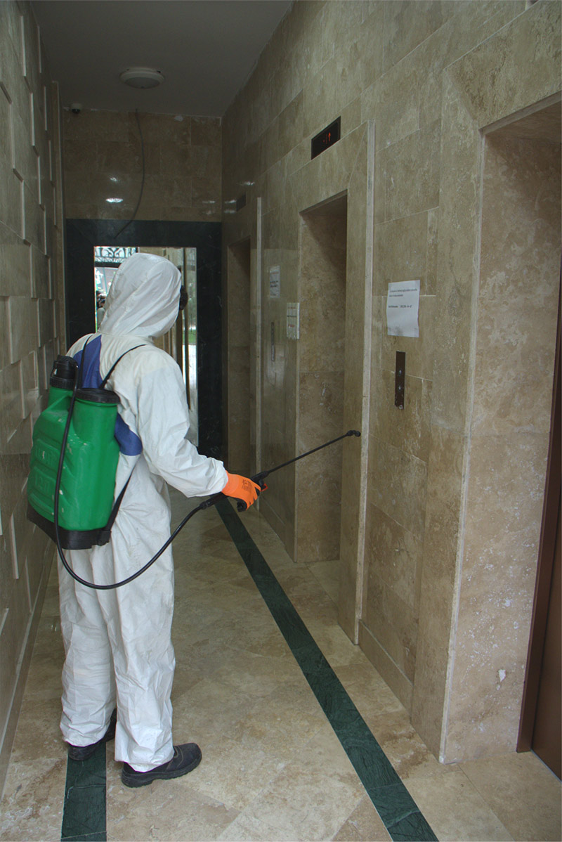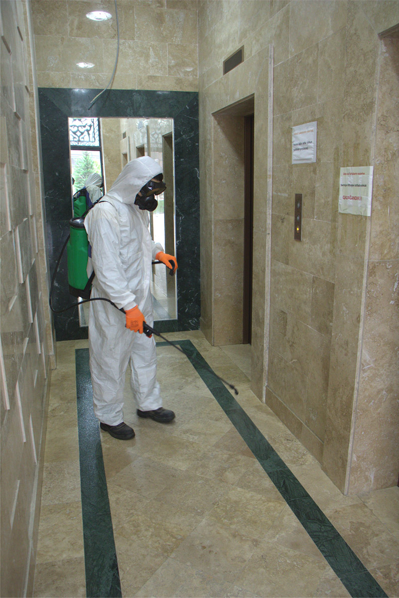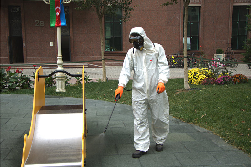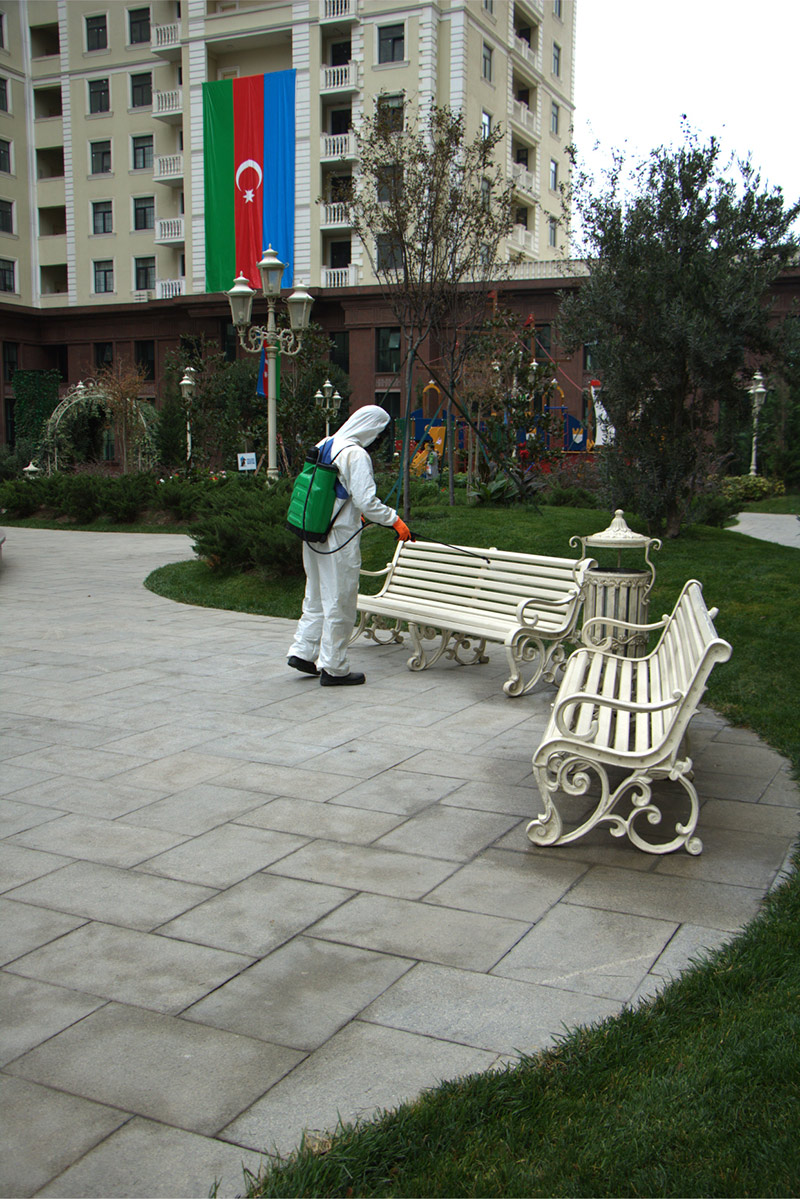 Yaşayış kompleksinin yalnız sakinlərin ixtiyarında olan 1,5 hektarlıq həyəti, uşaq və idman meydançası, bütün blokları və mərtəbələri tam dezinfeksiya olunub.