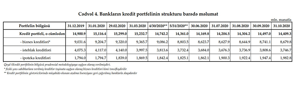 2020-ci ilin Oktyabr ayında bankların cəmi kredit portfeli 87,7 milyon manat azalaraq 14 milyard 409 milyon 300 min manata geriləyib. Sentyabrın sonunda bankların kredit portfeli 14 milyard 497 milyon manat təşkil etmişdi.
