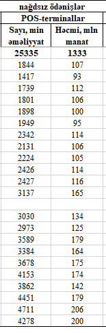 2020-ci ilin Oktyabr ayında POS-terminallar ilə 4 milyon 278 min əməliyyat üzrə 200 milyon manat məbləğində nağdsız ödəniş həyata keçirilib. Ötən ilin Oktyabr ayında bu rəqəmlər müvafiq olaraq 2 milyon 426 min və 114 milyon manat idi.
