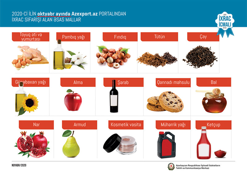 2020-ci ilin oktyabr ayında isə portala daxil olan ixrac sifarişlərinin dəyəri 49,8 milyon ABŞ dolları təşkil edib və ötən ilin müvafiq ayı ilə müqayisədə ixrac sifarişləri dəyər baxımından 21,5 faiz artıb. Cari ilin oktyabr ayında Azexport.az portalına ən çox ixrac sifarişi toyuq əti və yumurtası, pambıq yağı, fındıq, tütün, çay, günəbaxan yağı, alma, şərab, qənnadı məhsulu, ketçup, nar, armud, kosmetik vasitə mühərrik yağı, bal, boya, zəfəran, tibbi zəli və s. mallara daxil olub. 2017-ci ilin yanvar ayından 2020-ci ilin 31 oktyabr tarixinə kimi (46 ay ərzində) Azexport.az portalına dünyanın 142 ölkəsindən daxil olan ixrac sifarişlərinin dəyəri 2,9 milyard ABŞ dolları təşkil edib.