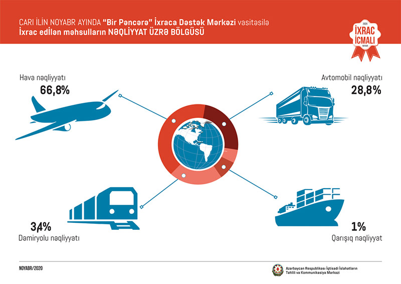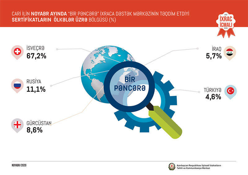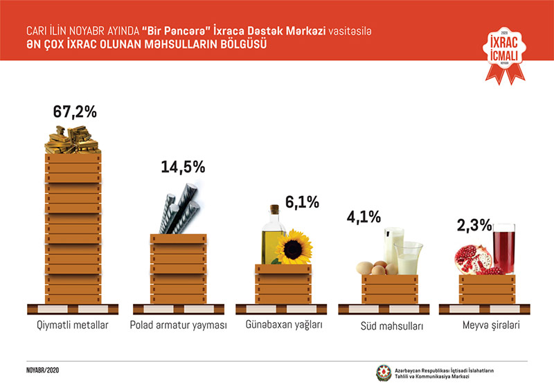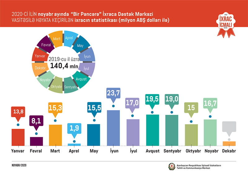 “İxrac İcmalı”nda göstərilib ki, bu ilin noyabr ayında “Bir Pəncərə” İxraca Dəstək Mərkəzi vasitəsi ilə həyata keçirilən qeyri-neft ixracının dəyəri 16,7 milyon ABŞ dolları olub. 2020-ci ilin yanvar-oktyabr ayları ərzində “Bir Pəncərə” İxraca Dəstək Mərkəzi tərəfindən yüzlərlə sahibkara ixracla bağlı müvafiq sertifikatlar verilib və bunun nəticəsində 165,3 milyon ABŞ dolları dəyərində qeyri-neft ixracı həyata keçirilib.