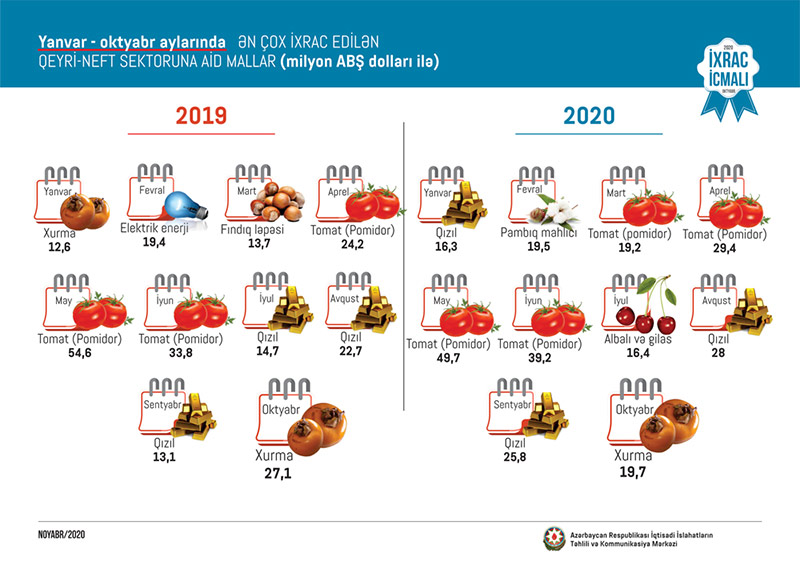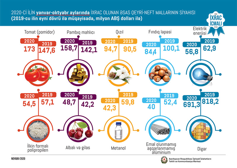 2020-ci ilin yanvar-oktyabr ayları ərzində ixrac edilən qeyri-neft sektoruna aid malların siyahısında tomat (pomidor 173 milyon ABŞ dolları) birinci, qızıl (sikkə kəsilməsində istifadə olunmayan, digər emal olunmamış formalarda - 158,7 milyon ABŞ dolları) ikinci və pambıq mahlıcı (94,7 milyon ABŞ dolları) üçüncü olub.