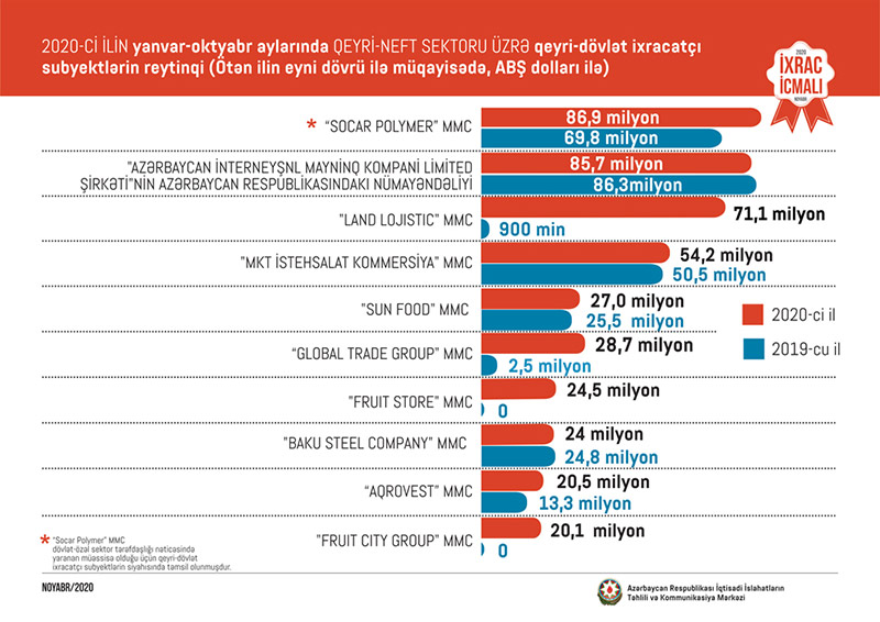 “İxrac İcmalı”nın noyabr sayında qeyri-neft sektoru üzrə əsas ixracatçı şirkətlərin reytinqi də təqdim edilib Bu ilin yanvar-oktyabr ayları üzrə hazırlanan qeyri-dövlət ixracatçı subyektlərin reytinqində ilk onluqda aşağıdakı şirkətlər təmsil olunurlar: “Socar Polymer” MMC, "Azərbaycan İnterneyşnl Mayninq Kompani Limited Şirkəti"nin Azərbaycan Respublikasındakı nümayəndəliyi, "Land Lojistic" MMC, "MKT İstehsalat Kommersiya" MMC, "Sun Food" MMC, "Global Trade Group" MMC, "Fruit Store" MMC, "Baku Steel Company", “Aqrovest” MMC və "Fruit City Group" MMC.