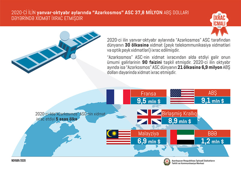 2020-ci ilin oktyabr ayında isə “Azərkosmos” ASC dünyanın 21 ölkəsinə 6,9 milyon ABŞ dolları dəyərində xidmət ixrac edib. “Azərkosmos” ASC-nin 2020-ci ilin yanvar-oktyabr aylarında xidmət ixracı həyata keçirdiyi əsas ölkələr Fransa, ABŞ, Birləşmiş Krallıq, Malayziya və BƏƏ-dir.