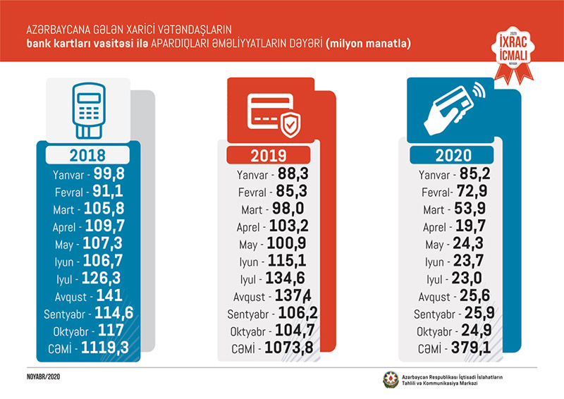 2020-ci ilin oktyabr ayında xarici vətəndaşların bank kartları vasitəsi ilə ölkəmizdə apardıqları əməliyyatların həcmi 24,9 milyon manat təşkil edib. 2020-ci ilin yanvar-oktyabr ayında isə əcnəbilər bank kartları vasitəsi ilə 379,1 milyon manatlıq əməliyyat aparıblar.