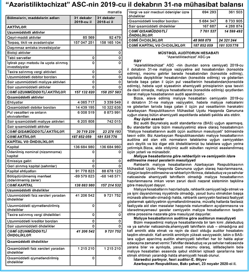 Sənədə əsasən, ötən il səhmdar cəmiyyətinin yığılmış zərəri 31,45% artaraq 89 milyon 580 min manata çatıb.