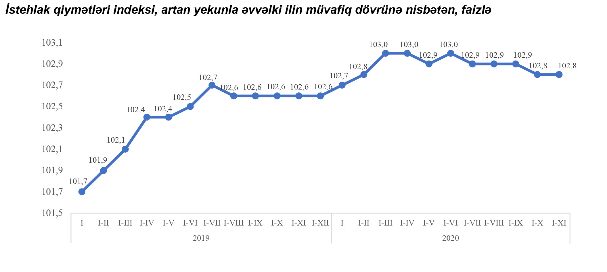 Azərbaycanda illik inflyasiya Noyabrda dəyişməz qalıb. Oktyabr ayında 2,8% təşkil atmiş qiymətlərin artımı Noyabr ayında da 2,8% artım olub.2020-ci ilin yanvar-noyabr aylarında istehlak qiymətləri indeksi 2019-cu ilin yanvar-noyabr aylarına nisbətən 2,8 faiz, o cümlədən ərzaq məhsulları, içkilər və tütün məmulatları üzrə 5,0 faiz, qeyri-ərzaq məhsulları üzrə 1,3 faiz, əhaliyə göstərilmiş ödənişli xidmətlər üzrə 1,0 faiz artıb.