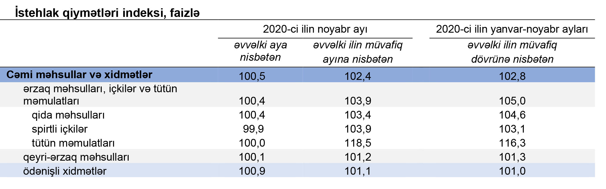 2020-ci ilin noyabr ayında qeyri-ərzaq məhsulları üzrə istehlak qiymətləri indeksi əvvəlki aya nisbətən 0,1 faiz, əvvəlki ilin noyabr ayına nisbətən 1,2 faiz artıb. 2020-ci ilin noyabr ayında əhaliyə göstərilmiş ödənişli xidmətlər üzrə istehlak qiymətləri indeksi əvvəlki aya nisbətən 0,9 faiz, əvvəlki ilin noyabr ayına nisbətən 1,1 faiz yüksəlib.