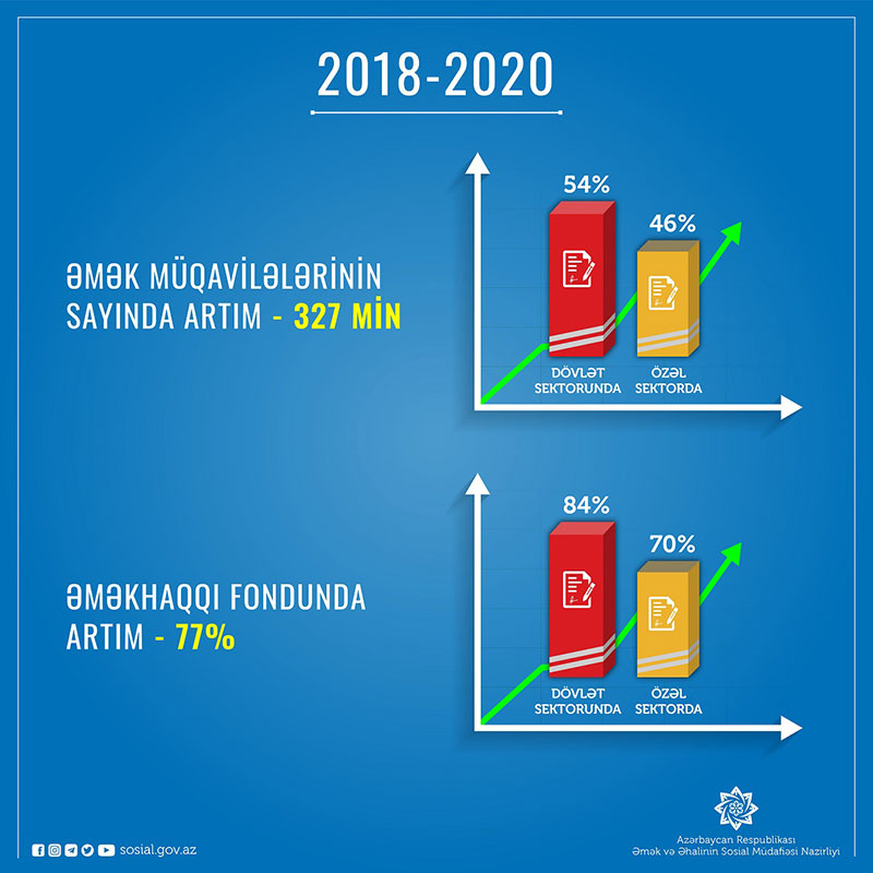 2018-ci ilin əvvəli ilə müqayisədə 2020-ci ilin 1 dekabr tarixinə əmək müqavilələrinin ümumi sayı 25% (327 min müqavilə) artıb. Onlardan 46%-i (230 minə yaxını) özəl, qalan hissəsi dövlət sektorunun payına düşür.