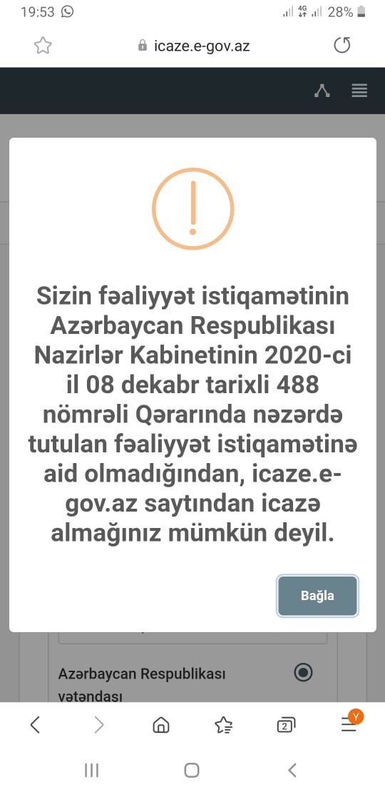 “Sizin fəaliyyət istiqamətinin Azərbaycan Respublikası Nazirlər Kabinetinin 2020-ci il 08 dekabr tarixli 488 nömrəli Qərarında nəzərdə tutulan fəaliyyət istiqamətinə aid olmadığından, icaze.e-gov.az saytından icazə almağınız mümkün deyil”.