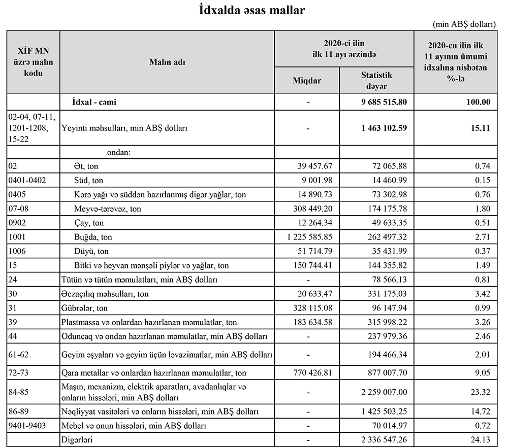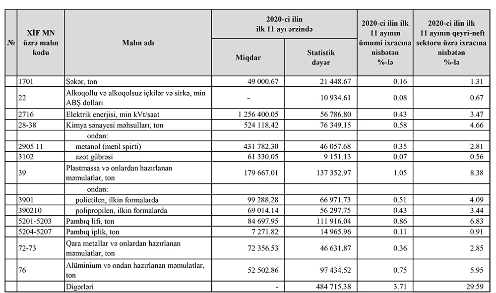 2020-ci ilin yanvar-noyabr ayları ərzində (11 ayda) Azərbaycanın ən çox ixrac və idxal etdiyi mallar.