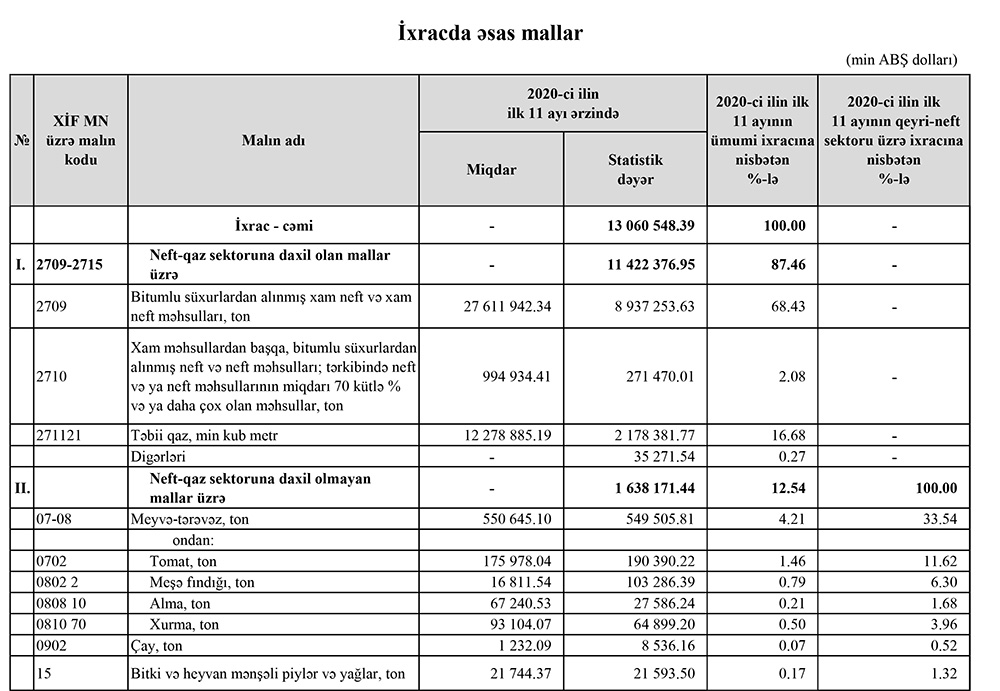 Marja Dövlət Gömrük Komitəsinə istinadən xəbər verir ki,ötən ilin 11 ayında xam neft ixracından Azərbaycana daxil olmuş xarici valyuta 14 milyard 6 milyon 510 min dollar ikən, 2020-ci ilin 11 ayı ərzində 8 milyard 937 milyon 253 min dollar təşkil edib. Xam neft satışından əldə edilən valyuta təxminin 32% azalıb.