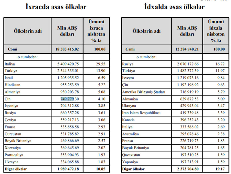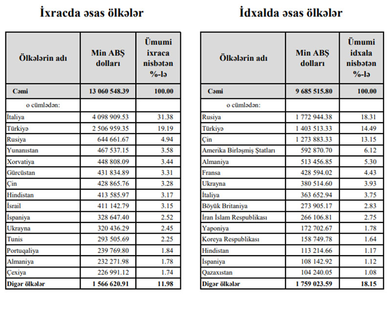 Ötən ilin 11 ayında Azərbaycana Rusiyadan 2 milyard 70 milyon 172 min dollarlıq, Türkiyədən 1 milyard 482 milyon 372 min dollarlıq, Çindən isə 749 milyon 779 min dollarlıq mallar idxal edilmişdi.