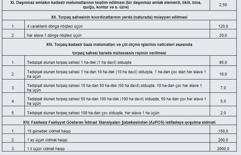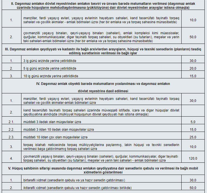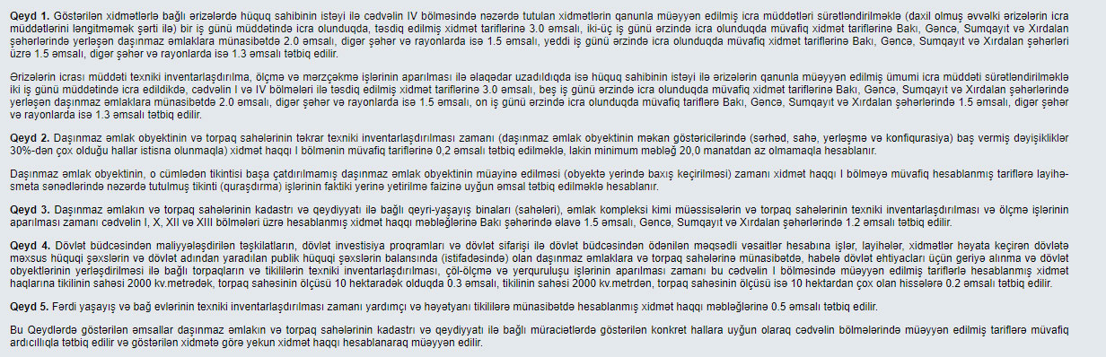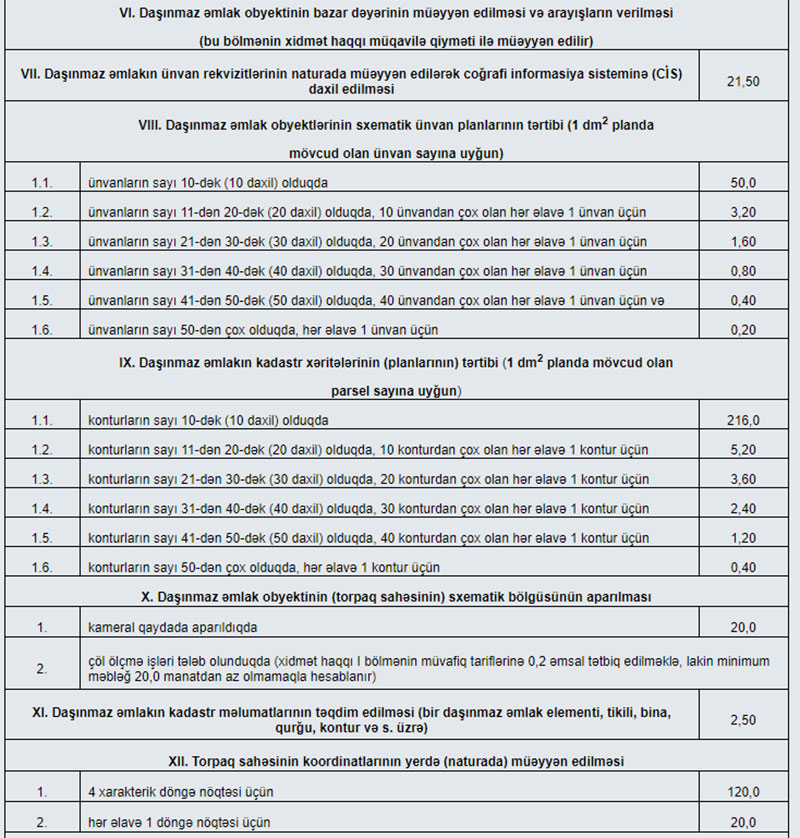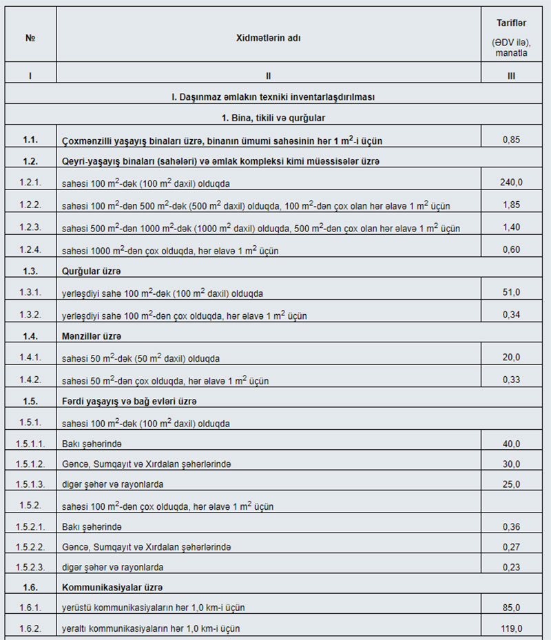 Əmlak Məsələləri Dövlət Xidmətinin qurumları tərəfindən Daşınmaz əmlakın və torpaq sahələrinin kadastrı, qeydiyyatı və texniki inventarlaşdırılması ilə bağlı göstərilən xidmətlərin tarifləri