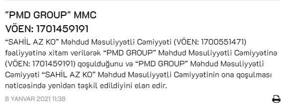 “Sahil Az Ko” MMC-nin fəaliyyətinə xitam verilərək “PMD Group” MMC-yə qoşulduğunu elan edib.