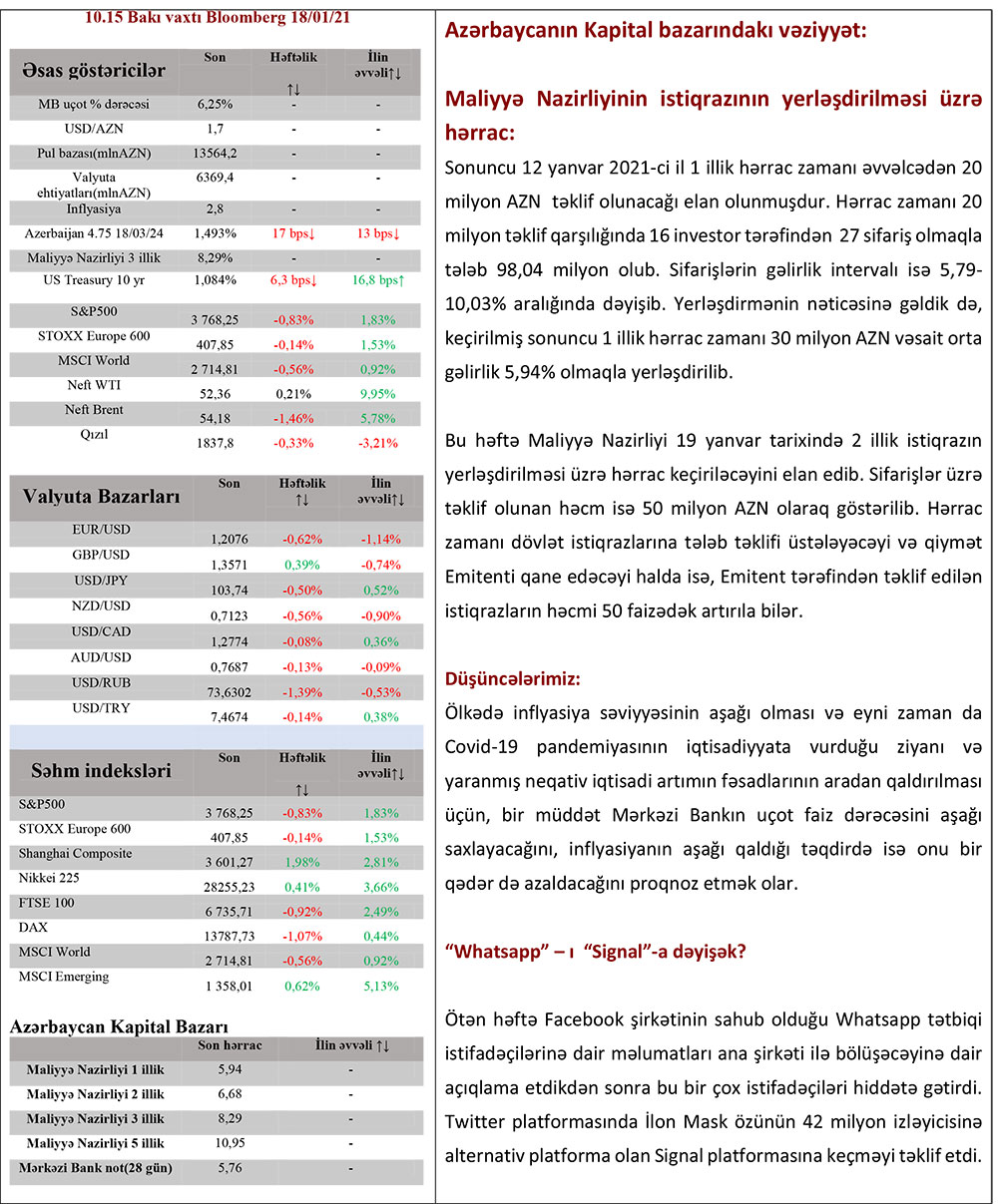 Bu həftə Maliyyə Nazirliyi 19 yanvar tarixində 2 illik istiqrazın yerləşdirilməsi üzrə hərrac keçiriləcəyini elan edib. Sifarişlər üzrə təklif olunan həcm isə 50 milyon AZN olaraq göstərilib. Hərrac zamanı dövlət istiqrazlarına tələb təklifi üstələyəcəyi və qiymət Emitenti qane edəcəyi halda isə, Emitent tərəfindən təklif edilən istiqrazların həcmi 50 faizədək artırıla bilər.