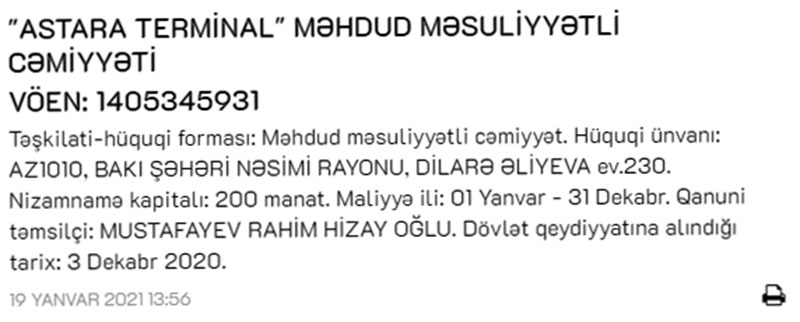 İqtisadiyyat Nazirliyi yanında Dövlət Vergi Xidməti “Astara Terminal” MMC-ni dövlət qeydiyyatına alıb.