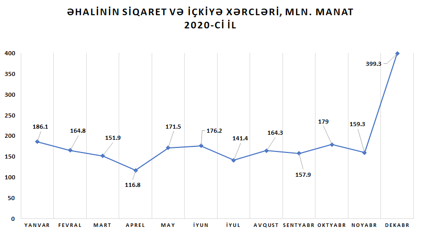 Qeyd edək ki, ölkədə aylıq siqaret və içki istehlakına nəzər yetirdikdə, istehlakın ən zəif olduğu aprel ayı (pandemiyanın başlanğıc dövrü – 116,8 mln. manat), ən yüksək dövrü isə dekabr ayına (399,3 mln. manat) təsadüf edib.