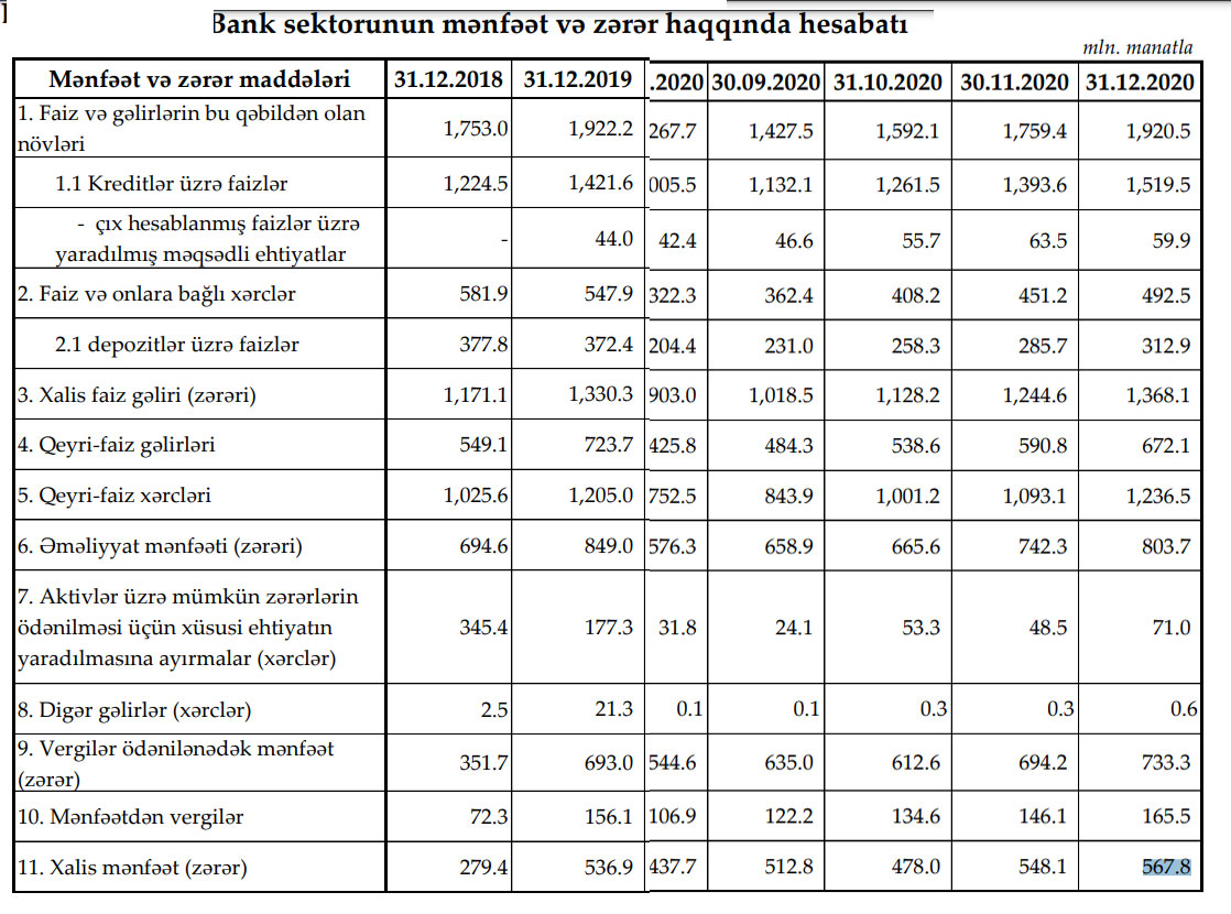 Azərbaycanın bank sektoru 2020-ci ili 567.8 milyon manat xalis mənfəət ilə başa vurub.