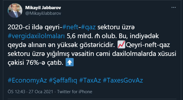 Nazir qeyd edib ki, bu, indiyədək qeydə alınan ən yüksək göstəricidir: "Qeyri-neft sektoru üzrə yığılmış vəsaitin cəmi daxilolmalarda xüsusi çəkisi 76%-ə çatıb".