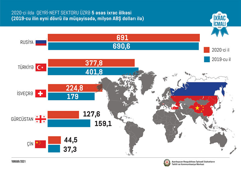 2020-ci il ərzində Rusiyaya 691 milyon, Türkiyəyə 377.8 milyon, İsveçrəyə 224.8 milyon, Gürcüstana 127.6 milyon və Çinə 44.5 milyon ABŞ dolları dəyərində qeyri-neft sektoruna aid mal ixrac olunub.