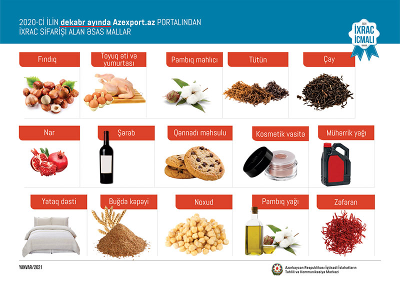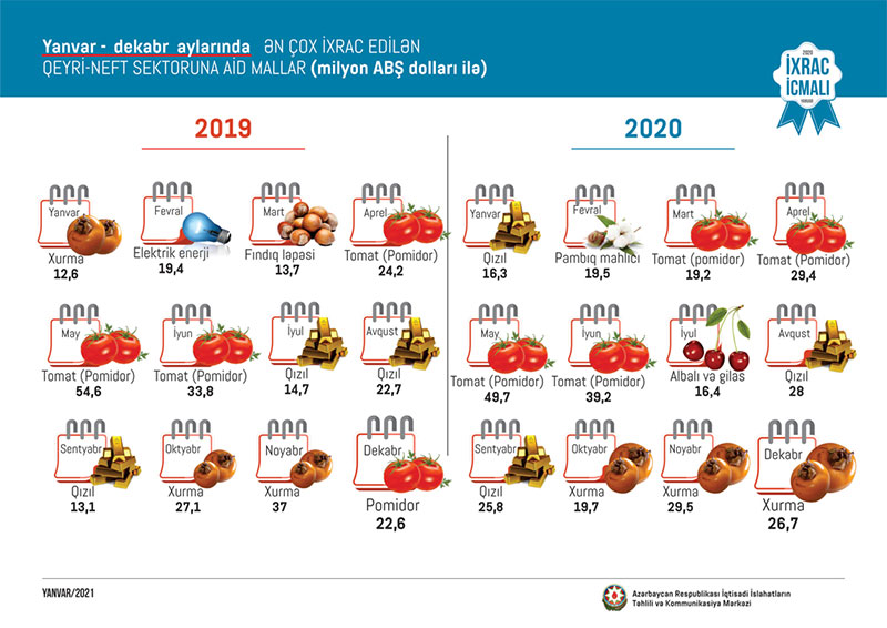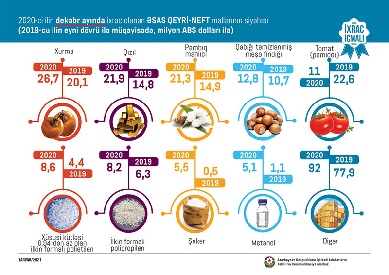 2020-ci ilin dekabr ayında qeyri-neft sektoru üzrə ixracda xurma (26.7 milyon ABŞ dolları) birinci, qızıl (21.9 milyon ABŞ dolları) ikinci, pambıq mahlıcı (21.3 milyon ABŞ dolları ) üçüncü yerdə qərarlaşıb.