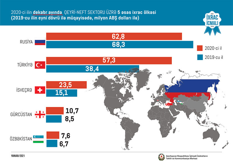2020-ci ilin dekabr ayında qeyri neft-qaz məhsulları üzrə ən çox mal Rusiyaya (62.8 milyon ABŞ dolları), Türkiyəyə (57.3 milyon ABŞ dolları), İsveçrəyə (23.5 milyon ABŞ dolları), Gürcüstana (10.7 milyon ABŞ dolları) və Özbəkistana (7.6 milyon ABŞ dolları) ixrac edilib.