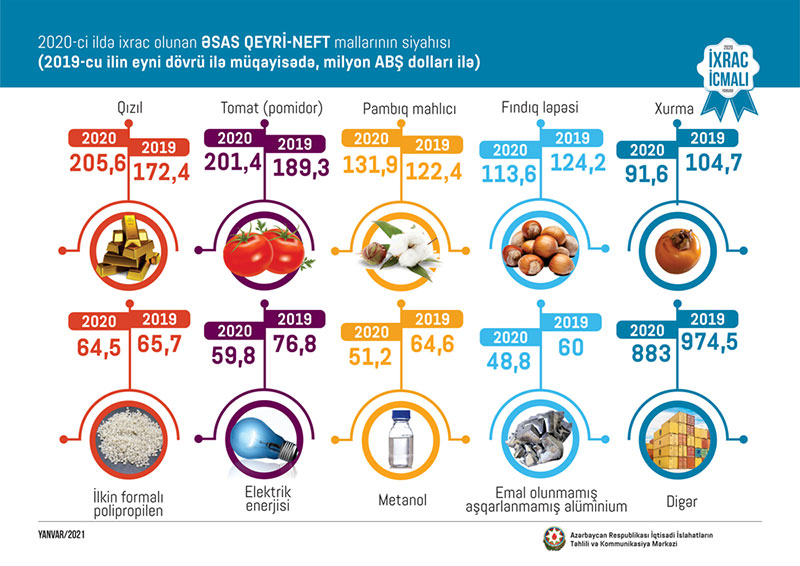2020-ci il ərzində ixrac edilən qeyri-neft sektoruna aid malların siyahısında qızıl (205.6 milyon ABŞ dolları) birinci, tomat (pomidor) (201.4 milyon ABŞ dolları) ikinci və pambıq mahlıcı (131.9 milyon ABŞ dolları) üçüncü olub.
