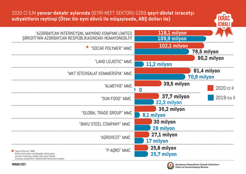 Marja xəbər verir ki, “İxrac İcmalı”nın yanvar sayında qeyri-neft sektoru üzrə əsas ixracatçı şirkətlərin reytinqi verilib. 2020-ci il üzrə hazırlanan qeyri-dövlət ixracatçı subyektlərin reytinqində ilk onluqda aşağıdakı şirkətlər təmsil olunurlar: "Azərbaycan İnterneyşnl Mayninq Kompani Limited Şirkəti"nin Azərbaycan Respublikasındakı nümayəndəliyi, “Socar Polymer” MMC, "Land Lojistic" MMC, "MKT İstehsalat Kommersiya" MMC, "Almeyvə" MMC, "Sun Food" MMC, "Global Trade Group" MMC, "Baku Steel Company", “Aqrovest” MMC və " P-Aqro" MMC..