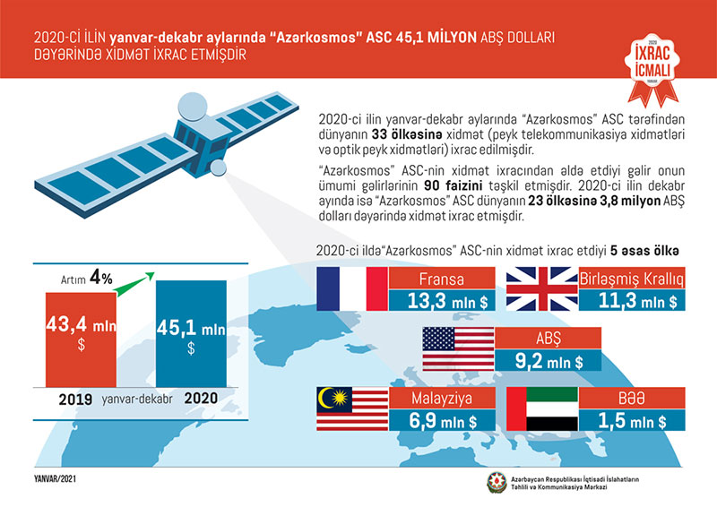 2020-ci ilin dekabr ayında isə “Azərkosmos” ASC dünyanın 23 ölkəsinə 3,8 milyon ABŞ dolları dəyərində xidmət ixrac edib.