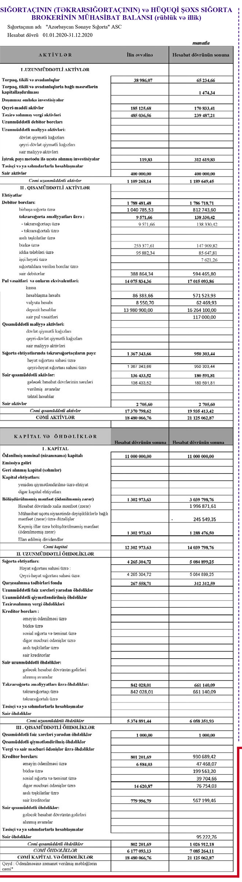 Bu il yanvarın 1-nə ASS-nin aktivləri 21 milyon 125 min manat olub ki, bu da illik müqayisədə 14,3% çoxdur. Hesabat dövründə şirkətin öhdəlikləri 14,7% artaraq 7 milyon 85 min manata, balans kapitalı isə 14,1% artaraq 14 milyon 40 min manata çatıb.