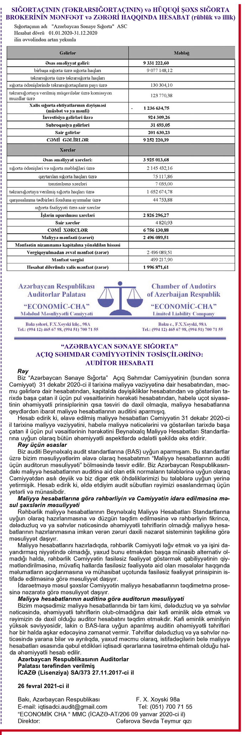 "Azərbaycan Sənaye Sığorta" ASC (ASS) 2020-ci ili 1 milyon 997 min manat xalis mənfəətlə başa vurub.