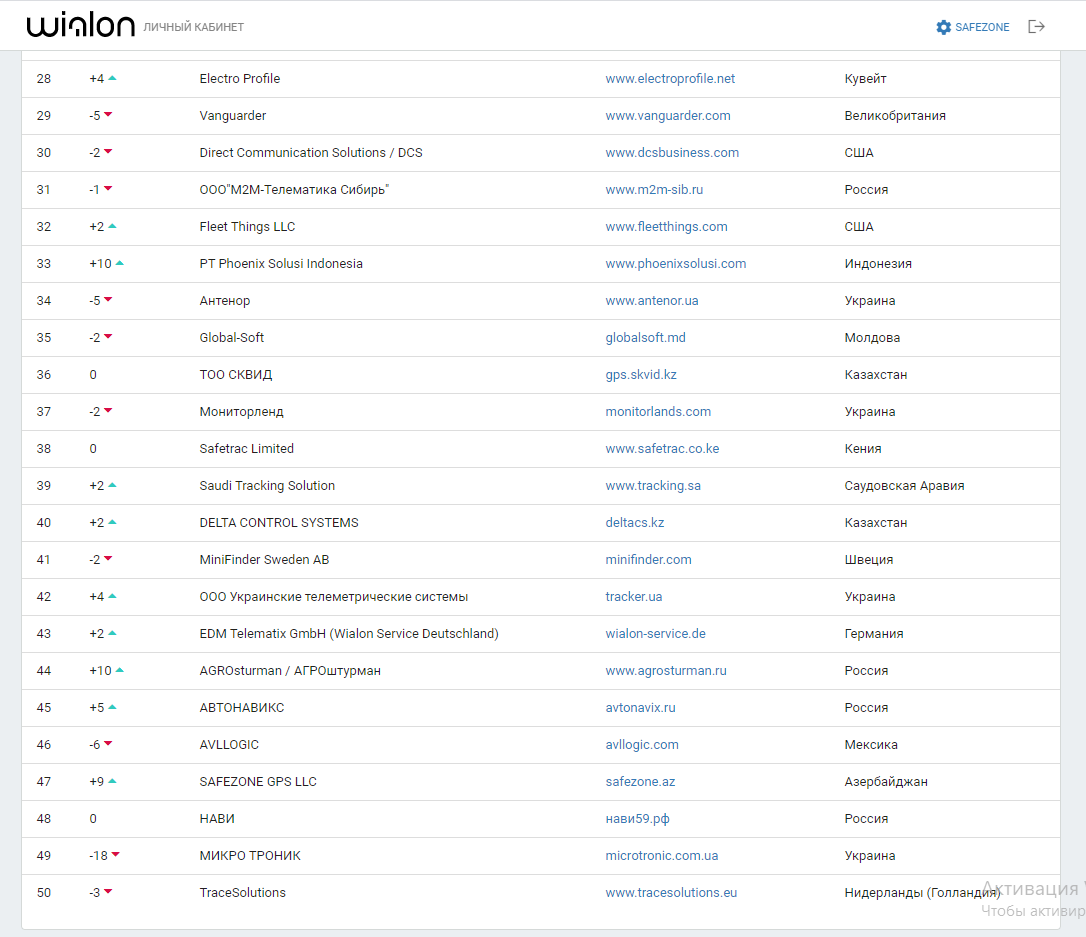 Dünyanın aparıcı GPS izləmə platforması olan "Wialon" Mart ayı üzrə TOP-50 şirkətlərin siyahısını açıqlayıb. Siyahıda Azərbaycanın "Safezone GPS" MMC şirkəti də yer almaqdadır.