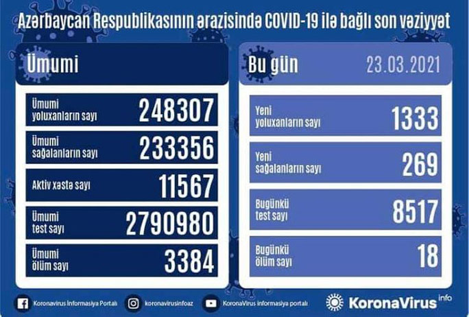 Azərbaycanda bir gündə 1333 nəfər COVID-19-a yoluxub, 18 nəfər vəfat edib.Azərbaycan Respublikasında koronavirus (COVID-19) infeksiyasına 1 333 yeni yoluxma faktı qeydə alınıb, 269 nəfər müalicə olunaraq sağalıb.