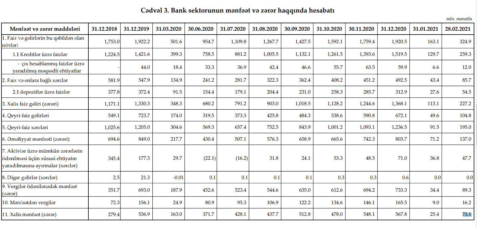 Azərbaycanın bank sektoru 2021-ci ilin yanvar-fevral dövrünü 73,1 milyon manat xalis mənfəət ilə başa vurub.