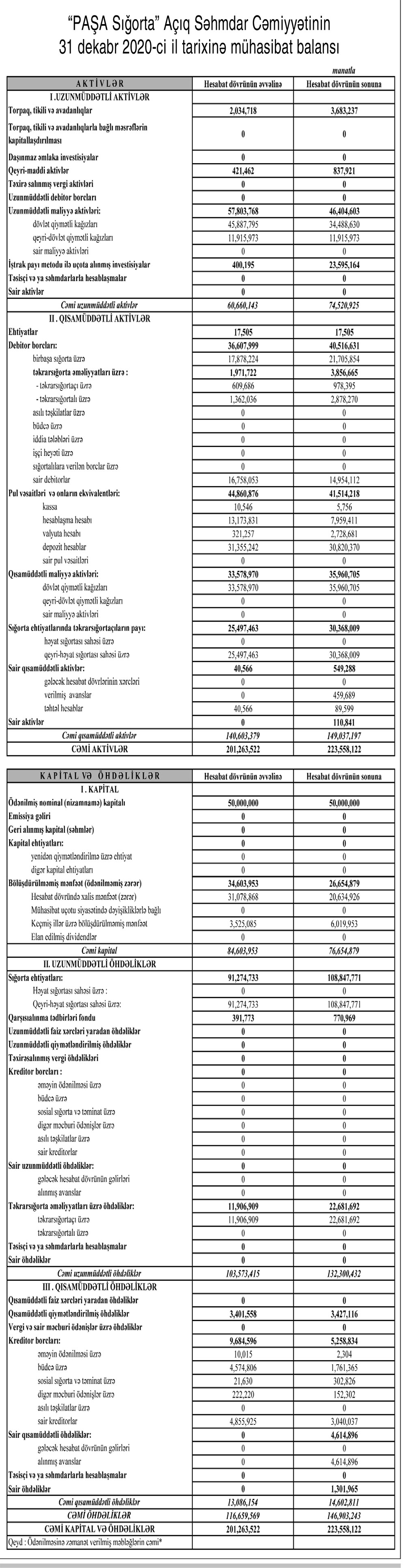 2019-cu illə müqayisədə 2020-ci ildə PAŞA Sığortanın topladığı sığrta haqları 9 milyon 191 min manat və ya 6,3% artaraq 154 milyon 654 min manata yüksəlib (2019-da 145 milyon 463 min manat). Şirkətin illik cəmi sığorta ödənişləri isə 18 milyon 654 min manat və ya 35,3% artaraq 71 milyon 452 min manata çatıb. PAŞA Sığorta 2019-cu ildə 52 milyon 797 min manat sığorta ödənişləri həyata keçirtmişdi.