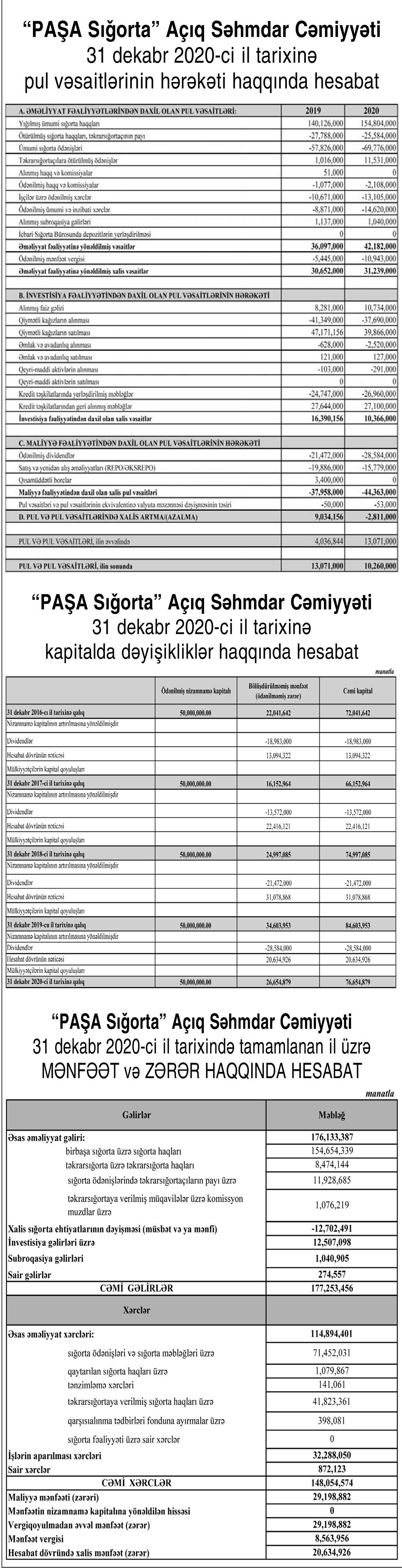 “PAŞA Sığorta” ASC 2020-ci ili 20 milyon 635 min manat xalis mənfəət ilə başa vurub. Halbuki, şirkət 2019-cu ili 31 milyon 78 min manat xalis mənfəət ilə bağlamışdı. Xalis mənfəətin azalması sığorta ödənişlərinin, təkrarsığortaya verilmiş sığorta haqlarının və işlərin aparılması xərclərinin artmasından qaynaqlanır.
