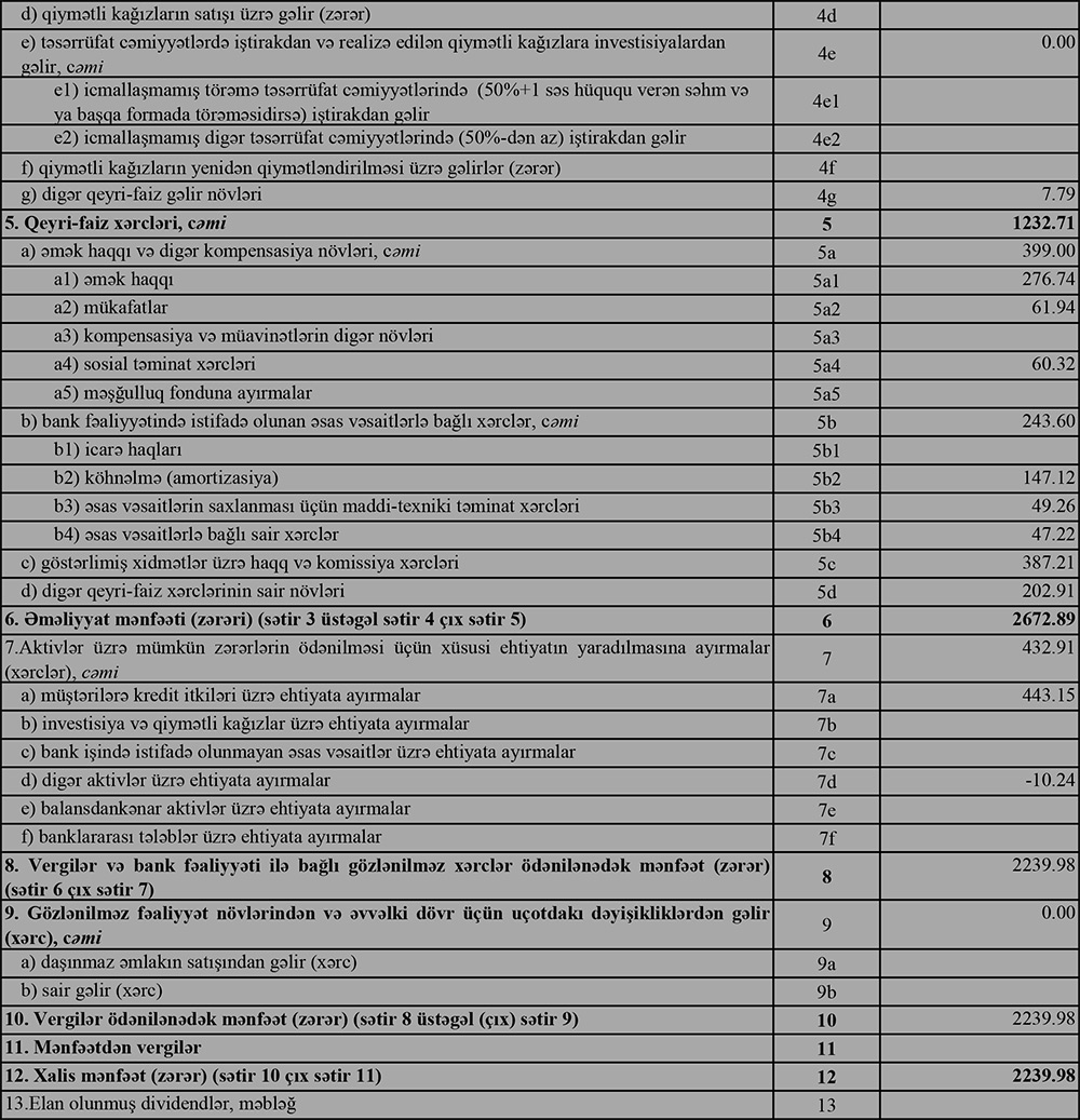 Müqayisə üçün qeyd edək ki, 2021-ci ilin yanvar-mart dövründə “Naxçıvanbank”ın cəmi əməliyyat gəlirləri 3 milyon 975 min manat, cəmi əməliyyat xərcləri 1 milyon 367 min manat, əməliyyat mənfəəti 2 milyon 608 min manat təşkil etmişdi. Bank əməliyyat mənfəətindən 430 min manat aktivlər üzrə mümkün zərərlərin ödənilməsi üçün xüsusi ehtiyatın yaradılmasına ayırmışdı.