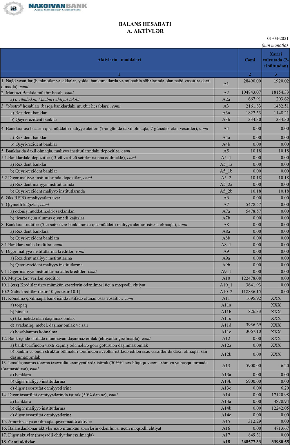 31 Mart 2021-ci il tarixində "Naxçıvanbank" 268 milyon 577 min manat cəmi aktivlərə, o cümlədən 122 milyon 478 min manat kredit portfelinə (müştərilərə verilən kreditlər) malik olub. Bank ötən ilin sonunda 298 milyon 577 min manat cəmi aktivlərə, 117 milyon 88 min manat kredit portfelinə malik idi.