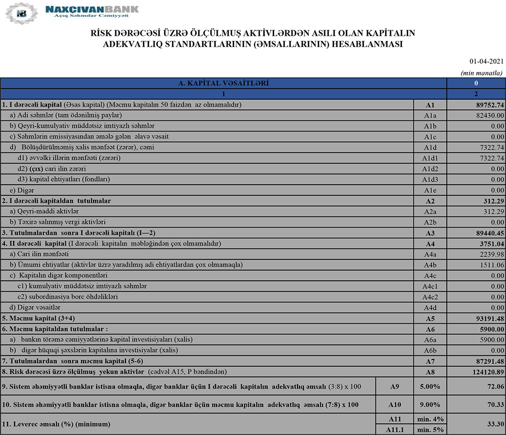 31 Mart 2021-ci il tarixində "Naxçıvanbank" 87 milyon 291 min manat məcmu kapitala malik olub.