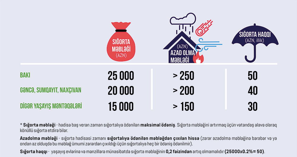 Yaşayış evləri və mənzillərin icbari sığortası üzrə sığorta məbləğləri və şərtsiz azadolma məbləğləri aşağıdakı kimi müəyyən edilir: