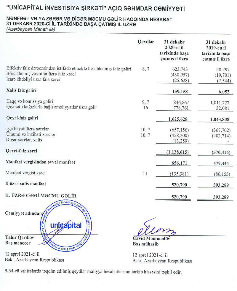Birjanın listinqində olan investisiya şirkəti 30% kapital gəliri qazanıbNizamnamə kapitalı 100% "Unibank" Kommersiya Bankı ASC-yə məxsus olan "Unicapital İnvestisiya Şirkəti" ASC 2020-ci ili 520 min manat xalis mənfəətlə başa vurub. Şirkətin yaydığı məlumata görə, bu, 2019-cu ilə nisbətən 32,4% çoxdur. Səhmdar Cəmiyyət 2018-ci ildə 300 min manat, 2019-cu ildə isə 393 min manat xalis mənfəət əldə etmişdi.